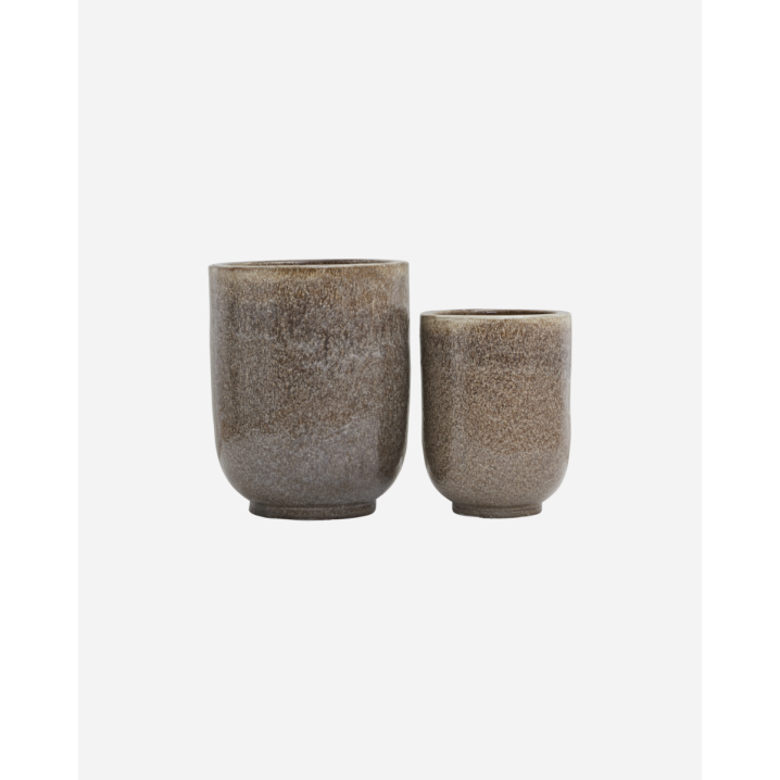 Skab et grønt og farverigt hjørne på terrassen med flotte krukker fra House Doctor. Med Pho får du et sæt med 2 potter i 2 forskellige størrelser i den smukkeste nougat farve. Potterne er lavet af keramik og har en smuk og unik glasur hvor ikke to er helt ens. Fyld potterne med planter, der matcher din stil og tilføj på den måde personlighed til dit udeområde. Krukkerne har hul i bunden og er frostsikre til -20 grader.